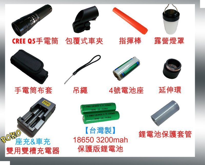 r-14【POKO】CREE Q5 四合一 旋轉變焦手電筒、指揮棒、露營燈、自行車燈 雙充雙電組