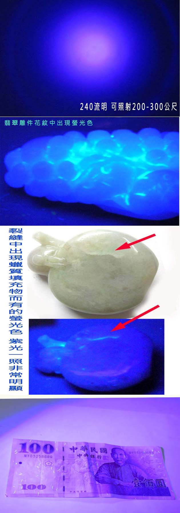 適用於 螢光防偽、玉石翡翠古董鑑定,票據防偽、驗鈔、釣魚、液壓檢漏、