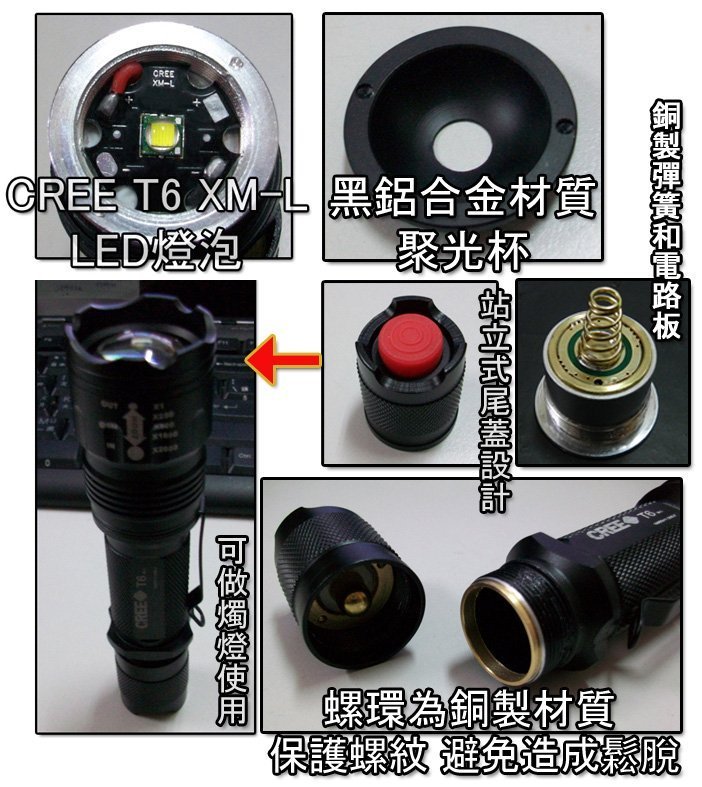 T-01 CREE XM-L T6 攻擊頭 伸縮變焦 使用單顆18650鋰電池! 3段燈源模式