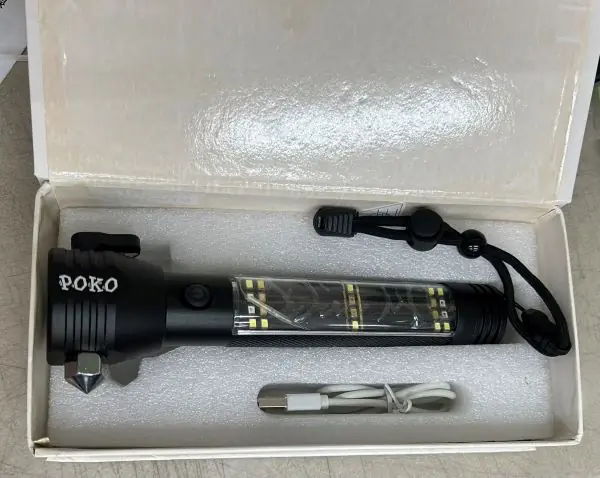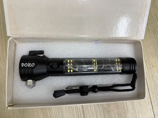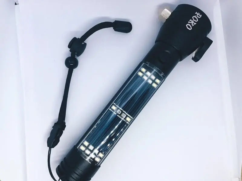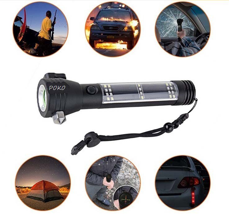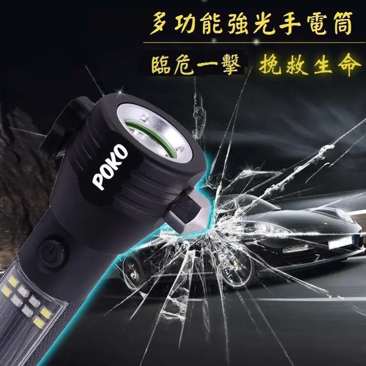 POKO公司貨 (多功能符合歐盟法規)行車安全必備 太陽能強光手電筒 擊破器 指北針 行動電源 切割器