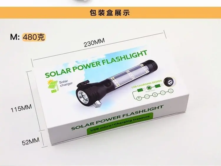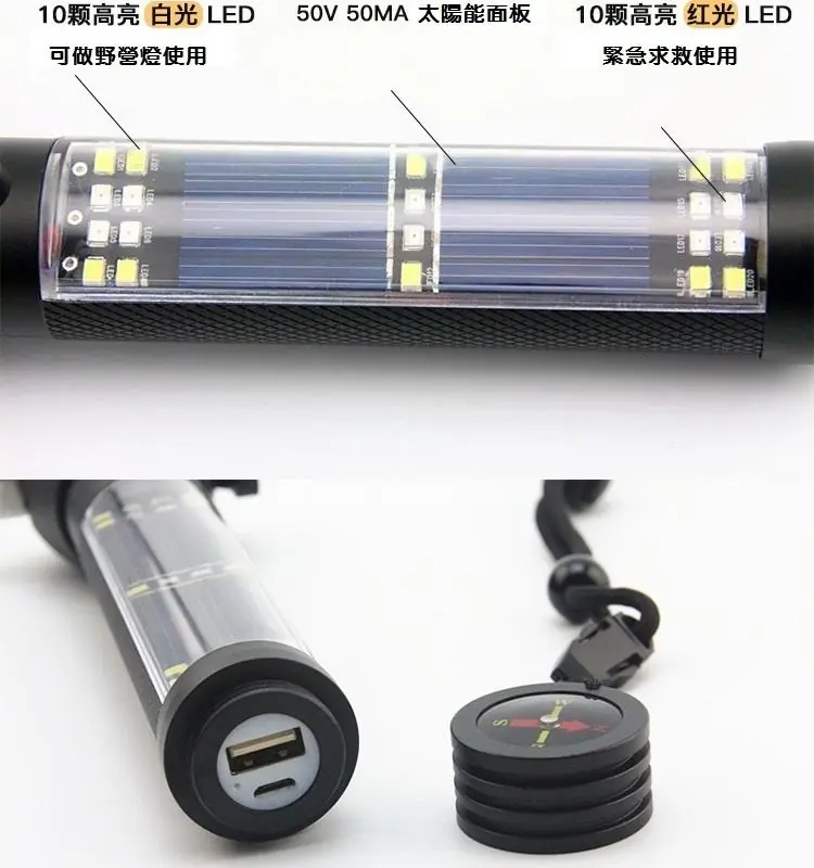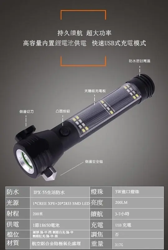 尾部USB行動電源 太陽能充電 筒身照明功能 筒身警示燈